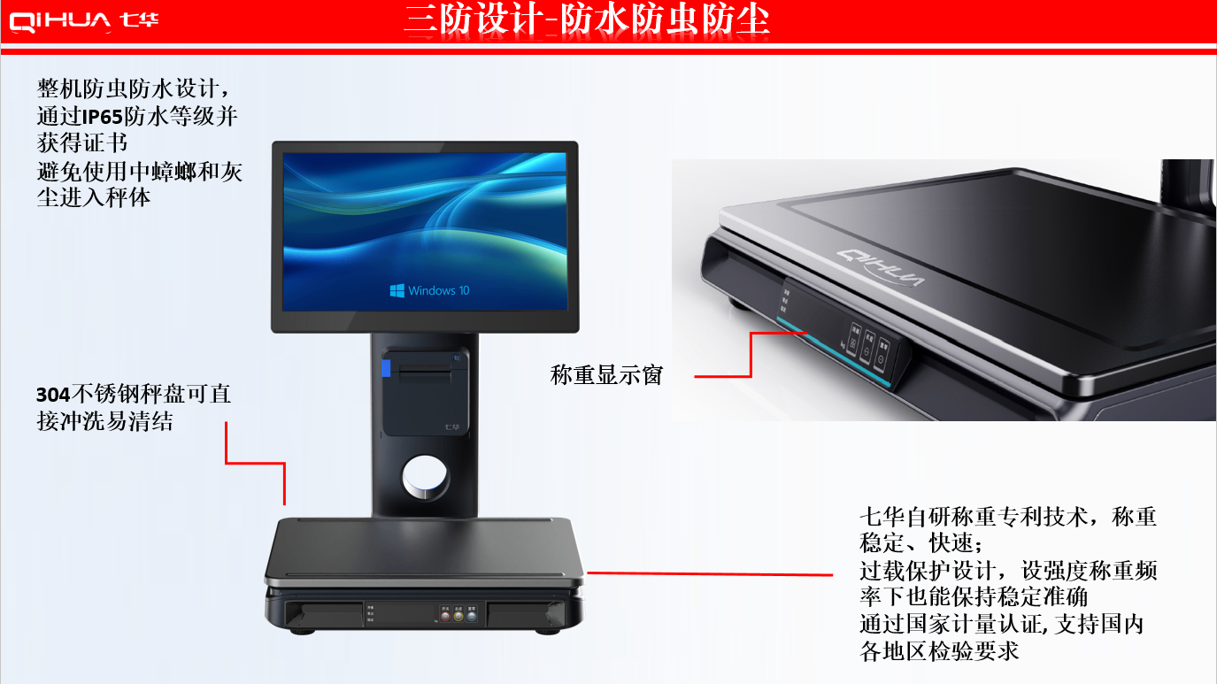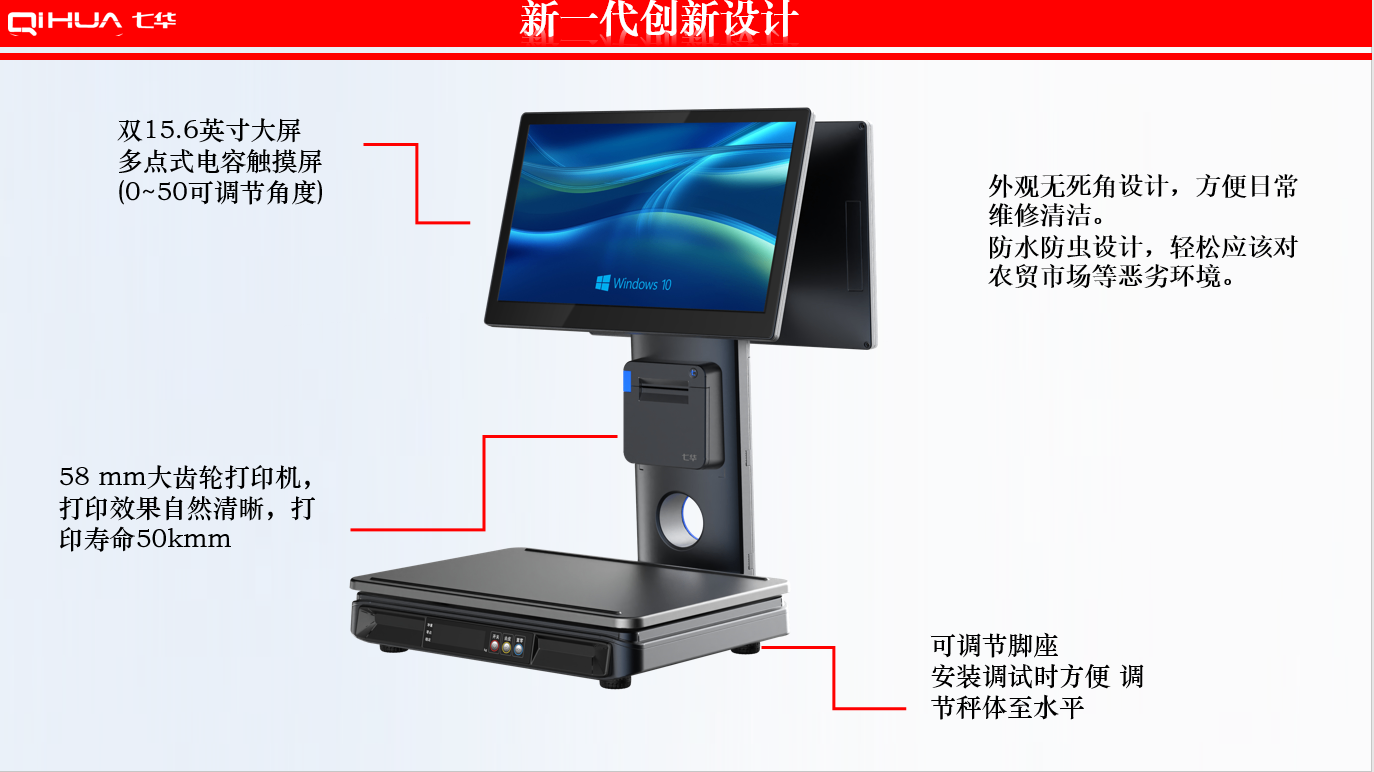 描述:新一代創(chuàng)新設計,雙15.6英寸大屏,多點式電容觸摸屏可(0~50可調節(jié)角度)。鋁合金立桿,全新的線倉設計,輕松藏線,防止線材暴露雜亂。臺面整潔有序。七華自研稱重專利技術,稱重穩(wěn)定、快速;過載保護設計,設強度稱重頻率下也能保持穩(wěn)定準確;通過國家計量認證, 支持國內(nèi)各地區(qū)檢驗要求。外觀無死角設計,方便日常維修清潔。 防水防蟲設計,輕松應該對農(nóng)貿(mào)市場等惡劣環(huán)境。